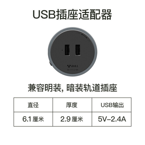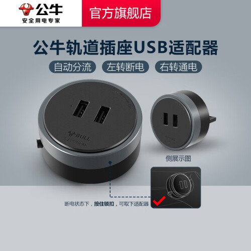 轨道适配器,黑色USB插座,旋转通断电,防脱锁扣设计。旋转适配器外圈即可轻松完成通断电,无需频繁的插拔用电器插头。