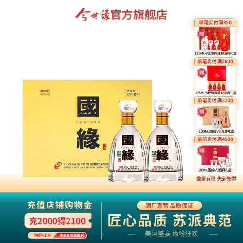 今世缘42度国缘四开是江苏今世缘酒业股份有限公司出产的一款高端中度浓香型白酒。这款白酒的外包装采取了设计构思巧妙的聚合型包装结构,体现了聚合生财,聚散总是缘的理念;进而在打开包装之后,让人在聚合中感悟“成大事,必有缘”,四通八达,“缘”来真好的美妙境界。这款由经过精挑细选的优质高粱、小麦、豌豆、大米、玉米,再配以当地优质水源,通过今世缘传统酿造技艺而成的42度国缘酒,以幽雅醇厚的独特口感,满足当下高端精英群体“高舒适度、低醉酒度”的健康饮酒诉求,成为中国高端中度白酒创领品牌。