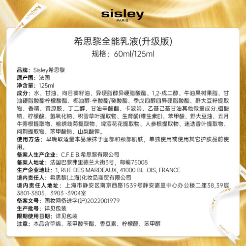 希思黎 (Sisley) 全能乳液125ml(面霜 补水保湿 深层滋养)送女友 送老婆 护肤礼物 每满300元,可减30元现金京东 推荐人: 关耳木易 发布时间:2022-07-07 11:14:09