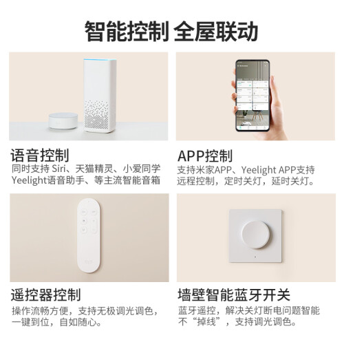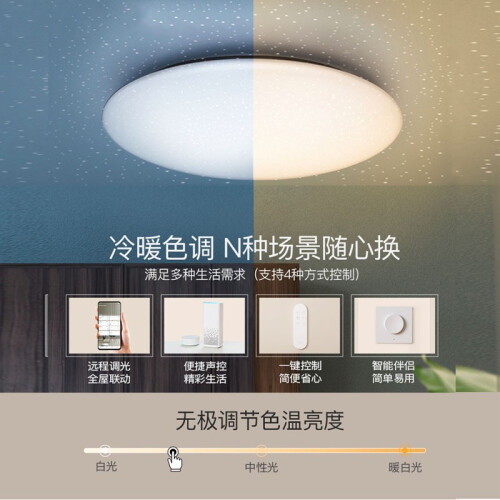 Yeelight星轨套系客厅灯中框薄至35mm,约为一枚矿泉水瓶盖的直径。纤薄身型,气质出众,给家一抹轻盈与俏皮。纤薄如玉,简约百搭,搭配如流水般的流畅线条,为素雅增添律动,好看不失去美感。侧身星轨镂空设计,点亮状态下,窥见好光轨迹。少许的线条,既勾勒出颜值,又引发对光的遐想。简约与繁复的平衡,既是美学,也是哲学。灯光明暗冷暖自由调节,烘托出家的好氛围。可智能开关、小爱同学、手机app、以及遥控器进行控制。