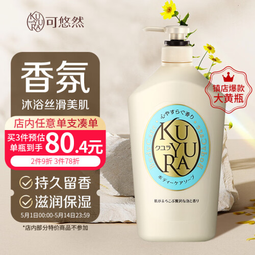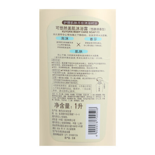 功效:滋润肌肤,清洁污垢主打成分:甘油,维生素E使用人群:适合各种肤质KUYURA可悠然是资生堂旗下洗护品牌,共有四种香型可供选择(欣怡幽香、恬静清香、花漾之恋、碧野悠悠)该系列的沐浴露含有护肤成分的香料,以日本花香和果香为基础,丰富细腻的泡沫,可保护肌肤不受伤害。添加肌肤护理成份,内部添加了有效呵护肌肤的成分,如甘油和维生素E能够保持角质层水份、加快修复肌肤紊乱。泡沫丰富又绵密,洗完不会有假滑的烦恼,又比用香皂洗会滋润很多,使用后持久的怡人香气,让人感受到生机盎然。最重要的是便宜又大碗,香味适中,男女老少都可。