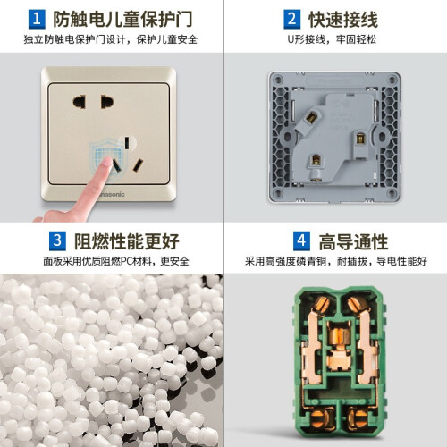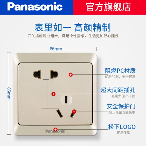松下(Panasonic)这款插座,外壳选用高温阻燃PC材质制作,能达到750℃的阻燃标准。内设独立安全防护门,单孔需要75N以上压力开启,避免手指或细小物体插入导致触电危险。锡磷青铜作为导电材料,有效提高导电性,插拔不松动。斜五孔设计,三孔同时使用不干涉,方便日常生活使用。