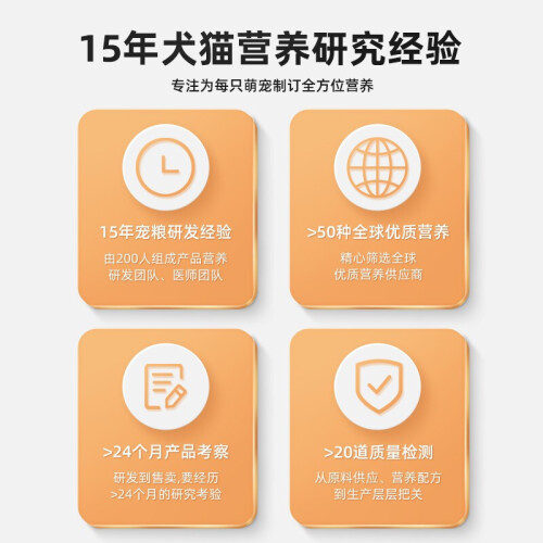 营养适中,能量适宜,避免宠物过量进食,引起肥胖等症状,针对犬牙齿设计,扁豆颗粒易于取食,圆形设计增加牙齿咬合颗粒深度,减少牙结石。