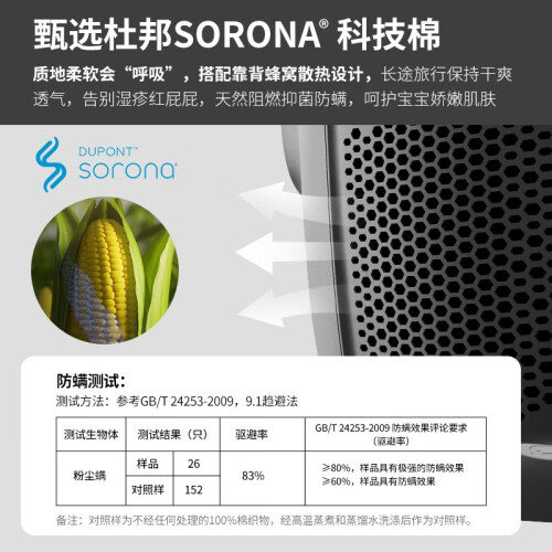 甄选杜邦SORONA°科技棉,质地柔软会“呼吸”,搭配靠背蜂窝散热设计,长途旅行保持干爽透气,告别湿疹红屁屁,天然阻燃抑菌防螨,呵护宝宝娇嫩肌肤