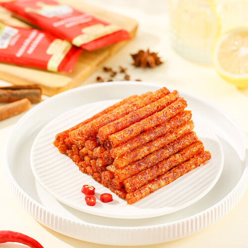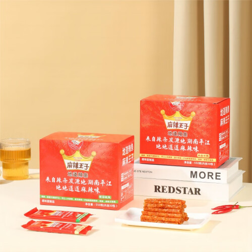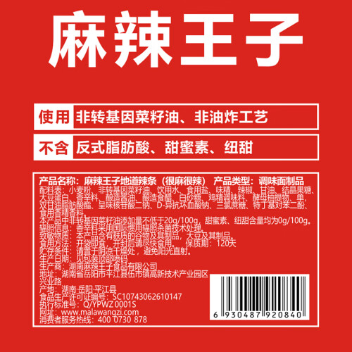 麻辣王子推出的这款辣条,选用小麦粉、非转基因菜籽油、食用盐等配料制成,每100g中含有蛋白质8.2g,脂肪28.8g。辣条色泽红润油亮,口感鲜香麻辣。独立小袋包装,方便携带,开袋即食。保质期为120天,建议在阴凉、干燥、避免阳光直射的条件下存放。