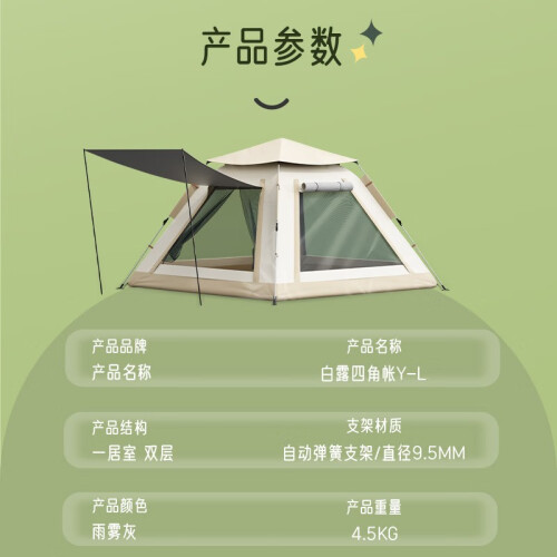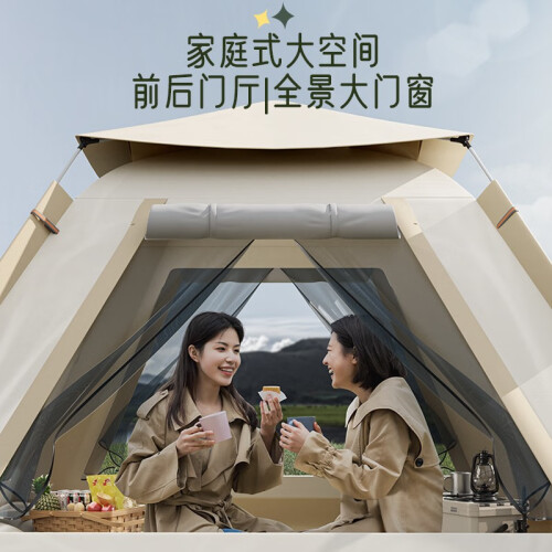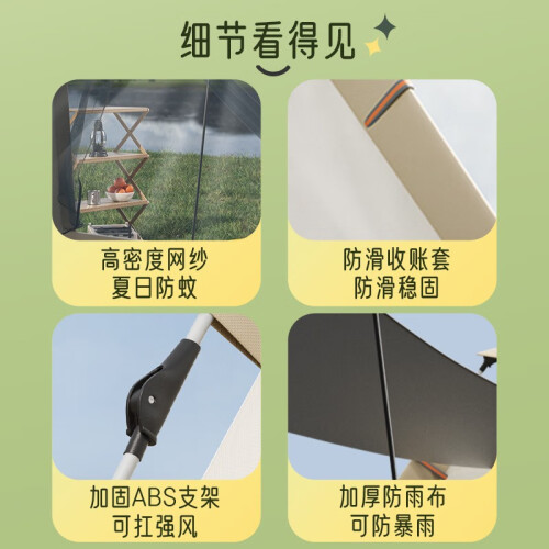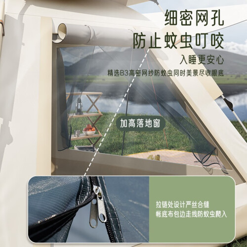 采用涤纶耐磨防水材质,防水性能佳,内里防晒涂层,有效隔绝99%太阳光。精选B3高密网纱防蚊虫同时美景尽收眼底,拉链处设计严丝合缝,帐底布包边走线防蚁虫爬入。