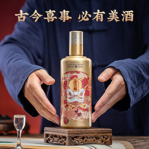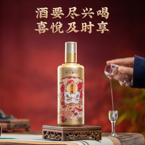 金六福 喜悦以承载美好寓意的中国风年画为主视觉,用大红灯笼、舞狮乐、鲤鱼、荷花、福字等元素传递美好祝福。精选纯粮固态优级酒体,加入5年以上老酒勾调而成。酒体挂杯明显,稠润不坠。具有舒适窖香味住的清雅谐调的复合香气。