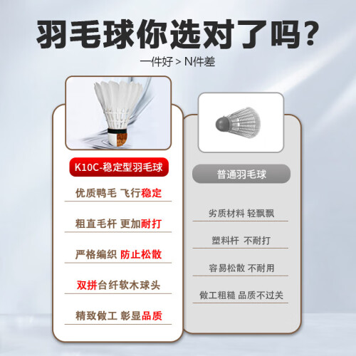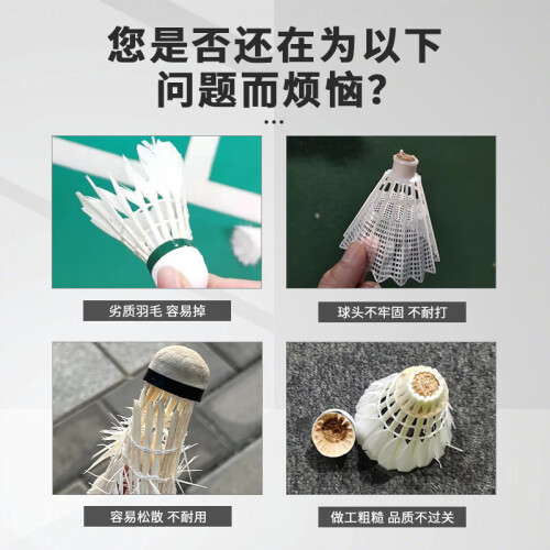 复合软木球头,弹性好,击打性和耐打性能相当出色,不易开裂,保证飞行稳定性。精选优质羽毛,球裙排列整齐,保证了飞行稳定,球速稳。粗壮厚实,耐打,飞行稳定,落点精准,不易折断。毛杆间隔均匀,长短一致整齐,不易折断,耐打稳定。