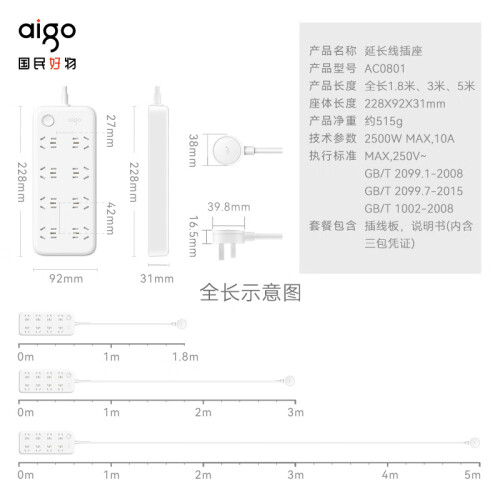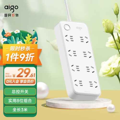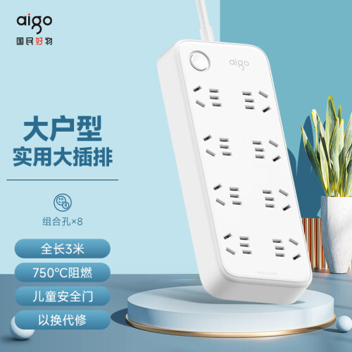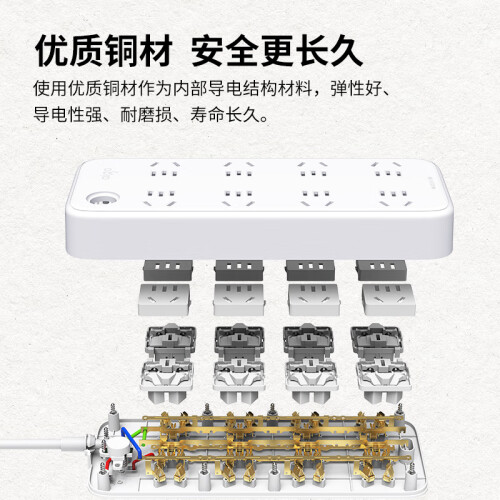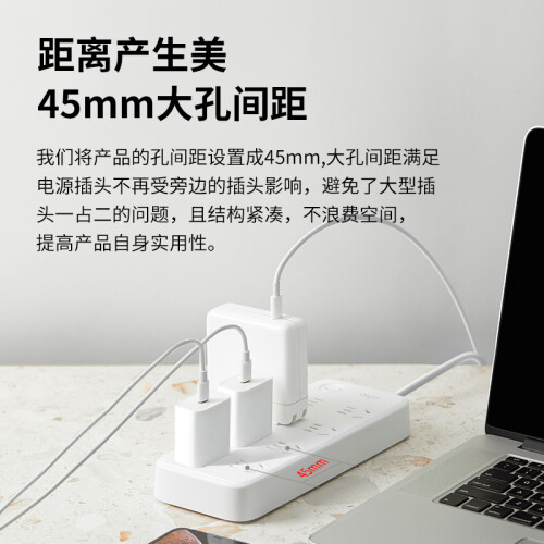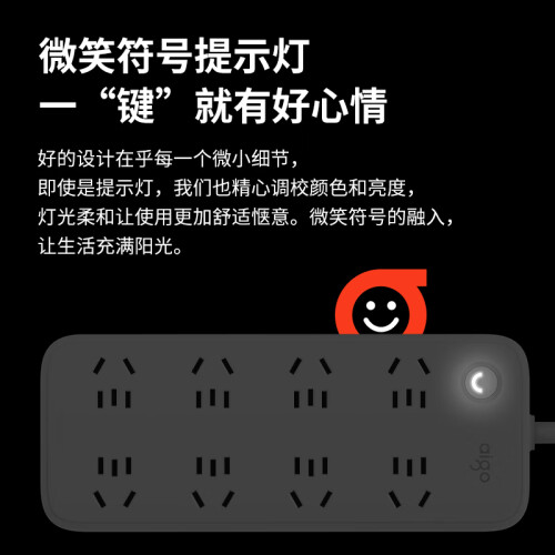 孔位升级至8位,同时又确保体积较为小巧,节省空间。圆润的外观设计,搭配微笑符号指示灯,传递微笑正能量,让生活满满幸福感。孔间距设置成45mm,大孔间距满足电源插头不再受旁边的插头影响,避免了大型插头一占二的问题,且结构紧凑,不浪费空间。