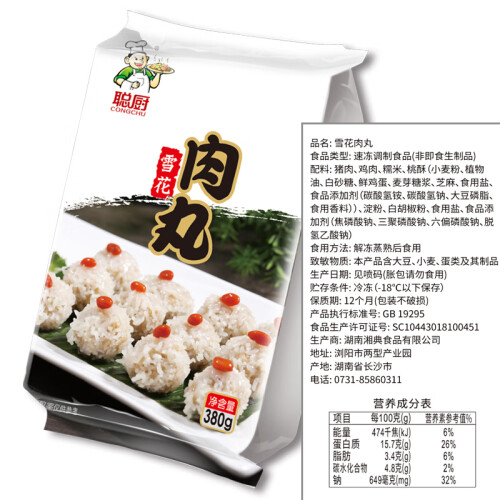 聪厨食品始创于2002年,为湖南省农业产业化龙头企业,二十年专做湘菜。旗下拥有“聪厨”、“食得迷”“湘典”等知名品牌,研发部湘厨师傅有19年湘菜制作经验,目前已开发速冻调理制品、酱卤制品、蔬菜制品、水产制品、家庭方便菜等多类特色产品。这款珍珠丸子,主要配料有猪肉、鸡肉、糯米、桃酥等,蒸好后的珍珠丸子,晶莹发亮,肉质绵软。规格:380g。