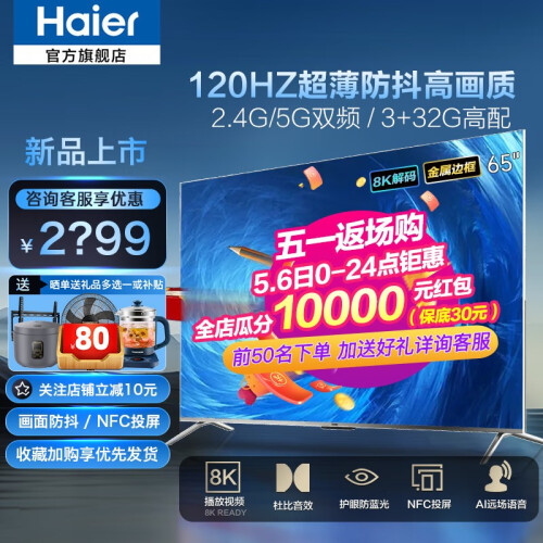 当前的位置: 首页 > 今日值得买 > 海尔(Haier)电视 新高色域 4K超高清 护眼超薄全面屏 8K解码免遥控智能 教育液晶平板品质电视机 65英寸 120HZ杜比3+32G双频【高端旗舰】