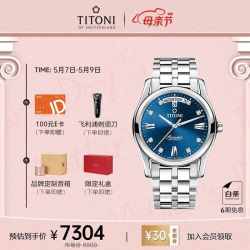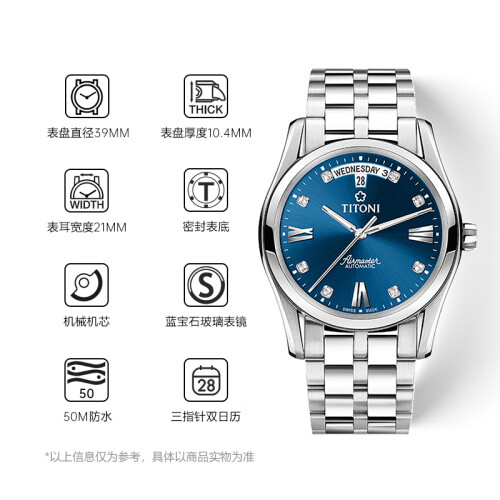 当前的位置: 首页 > 今日值得买 > 梅花(Titoni)瑞士手表 空中霸王系列 机械钢带男士腕表39mm 93808-S-259送男友