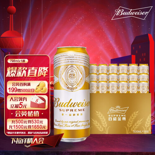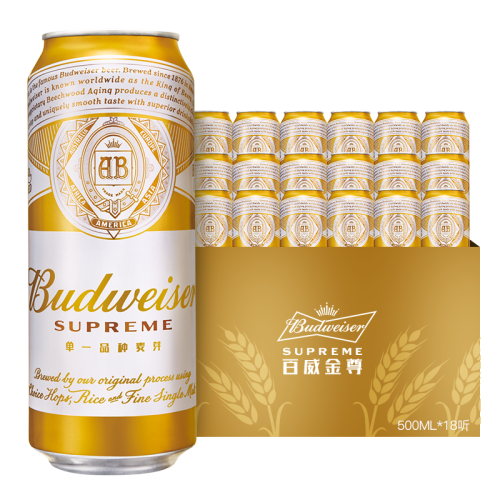 当前的位置: 首页 > 今日值得买 > 百威(Budweiser)金尊啤酒500ml*18听整箱装单一品种麦芽啤酒Supreme