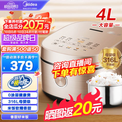 当前的位置: 首页 > 今日值得买 > 美的(Midea)无涂层电饭煲 0涂层电饭锅 家用4升智能预约316L不锈钢内胆电饭煲 特设母婴专属功能 MB-RC436