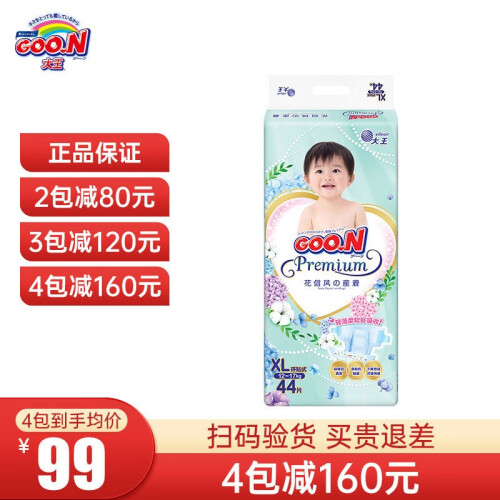 当前的位置: 首页 > 今日值得买 > 大王(GOO.N)花信风纸尿裤婴儿尿不湿透气尿片尿裤男女宝贝通用隔尿垫吸水尿布 纸尿裤 XL44片(12-17KG)