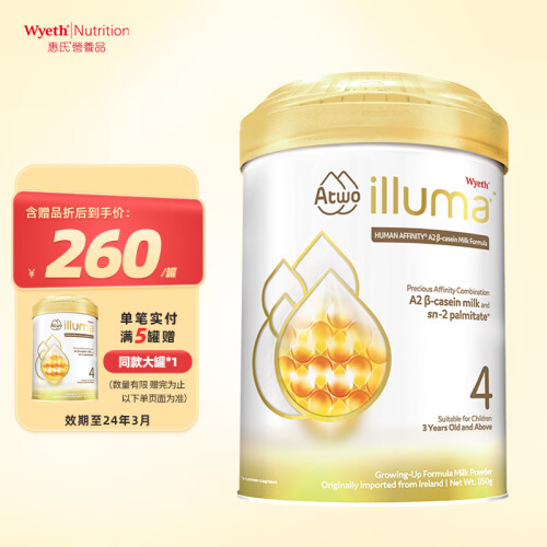 当前的位置: 首页 > 今日值得买 > 惠氏Wyeth启赋Illuma A2婴幼儿奶粉四段3岁及3岁以上850g/罐