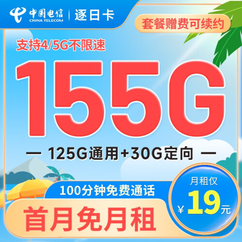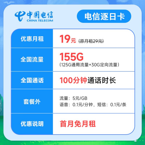 当前的位置: 首页 > 今日值得买 > 中国电信 电信流量卡手机卡通话卡5G鲸鱼上网卡流量不限速低月租电话卡 逐日卡19元155G+100分钟