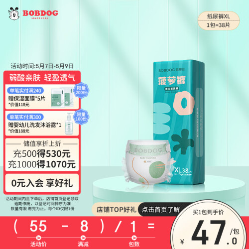 当前的位置: 首页 > 今日值得买 > 巴布豆(BOBDOG)新菠萝纸尿裤XL号38片(12-17KG)加大码婴儿尿不湿柔软超薄大吸量