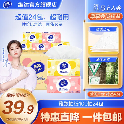 当前的位置: 首页 > 今日值得买 > 维达(Vinda)雅致 细韧抽纸3层24包 软抽面巾纸擦手纸 餐巾纸抽卫生纸自然无香 雅致 24包箱装