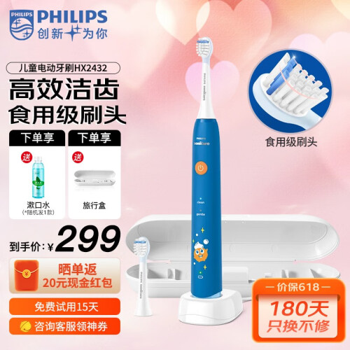 当前的位置: 首页 > 今日值得买 > 飞利浦(PHILIPS)儿童电动牙刷男/女智能声波震动/轻柔清洁/温和护龈2档模式自带2支刷头儿童礼物 蓝HX2432/01