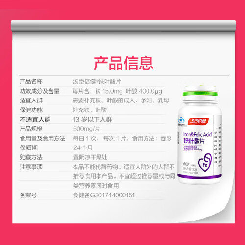 当前的位置: 首页 > 今日值得买 > 汤臣倍健 铁叶酸片500mg*60片 成人男女备孕孕妇乳母营养补铁