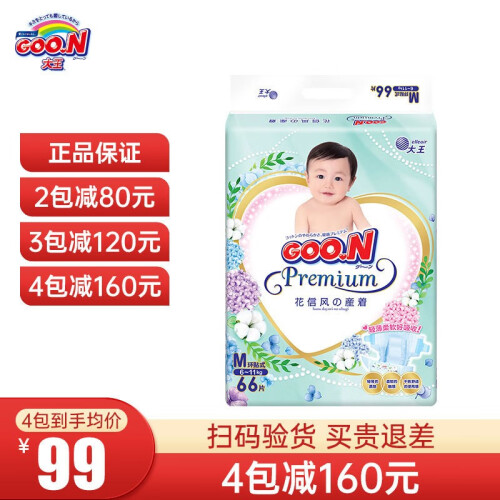 当前的位置: 首页 > 今日值得买 > 大王(GOO.N)花信风纸尿裤婴儿尿不湿透气尿片尿裤男女宝贝通用隔尿垫吸水尿布 纸尿裤 M66片 (6-11KG)