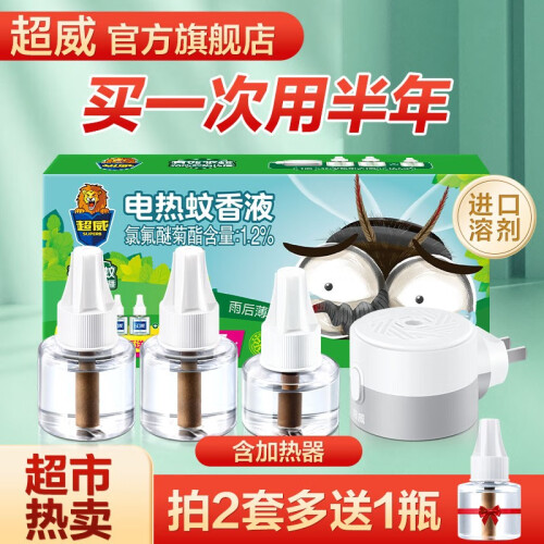 当前的位置: 首页 > 今日值得买 > 超威(SUPERB)电热蚊香液 驱蚊液电蚊液灭蚊液 灭蚊器电蚊香 家用套装品牌 3瓶1器(驱蚊165晚 )
