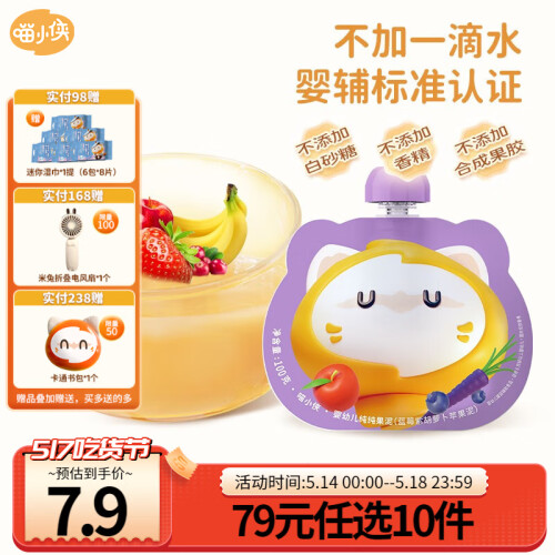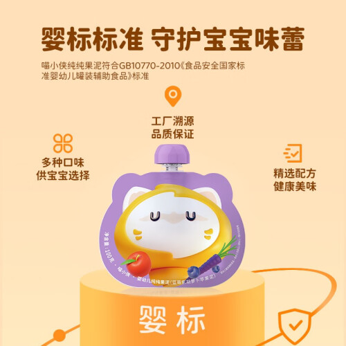 当前的位置: 首页 > 今日值得买 > 喵小侠【婴标】婴幼儿纯纯果泥 6个月以上宝宝零食辅食果泥婴儿100g 蓝莓紫胡萝卜