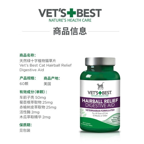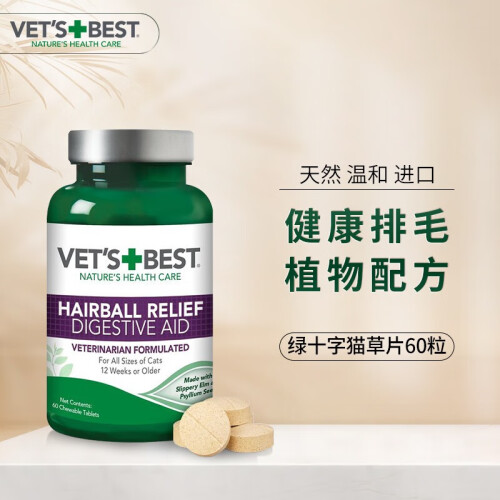 当前的位置: 首页 > 今日值得买 > VET'S BEST维倍思 绿十字猫草片 美国进口猫咪化毛球片 宠物排除毛球化毛膏 60粒*2瓶