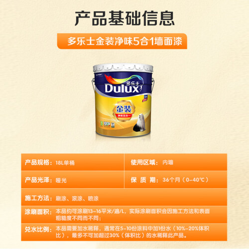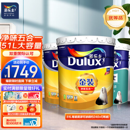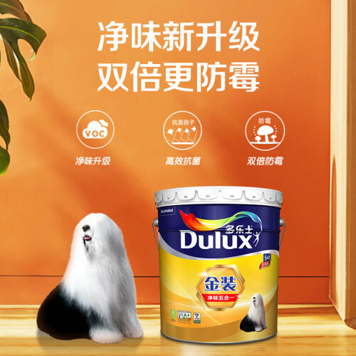 当前的位置: 首页 > 今日值得买 > 多乐士(Dulux)金装五合一净味内墙乳胶漆 环保抗菌防霉油漆涂料墙面漆 A8188 51L套装(18L面漆*2+15L底漆*1)