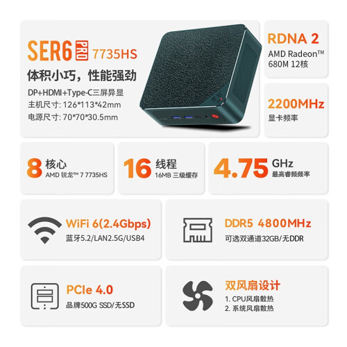 当前的位置: 首页 > 今日值得买 > 零刻SER6 Pro VEST 版本 高性能AMD锐龙7 8核16线程 7735HS游戏办公迷你主机 深空灰(HDMI+DP) 16G/500G