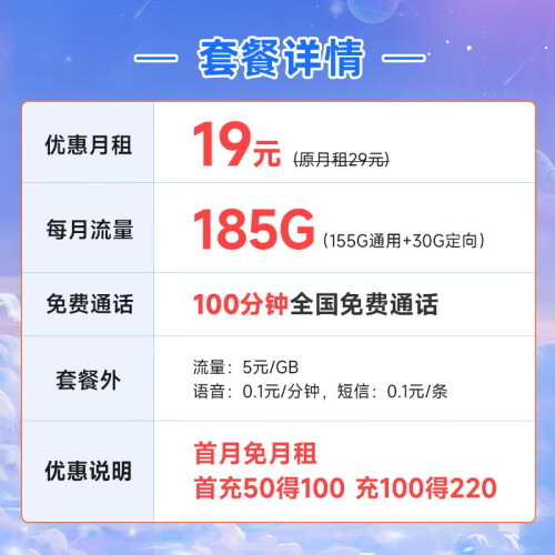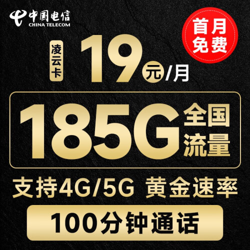 当前的位置: 首页 > 今日值得买 > 中国电信 电信流量卡手机卡通话卡5G鲸鱼上网卡流量不限速低月租电话卡 【凌云卡】19元+185G流量+100分钟通话