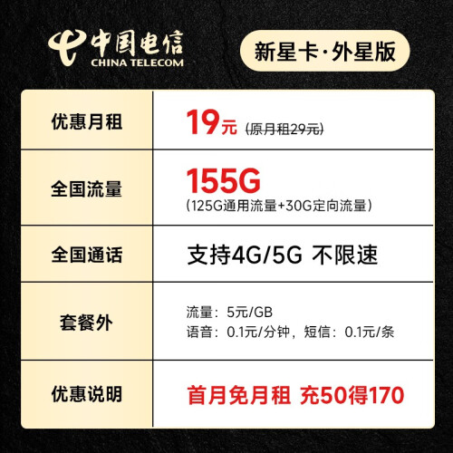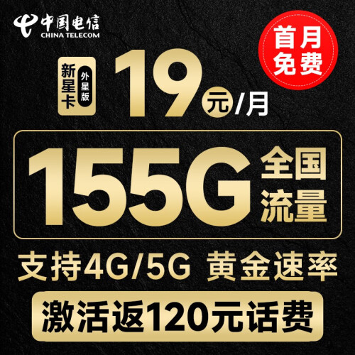 当前的位置: 首页 > 今日值得买 > 中国电信 电信流量卡手机卡通话卡5G鲸鱼上网卡流量不限速低月租电话卡 新星卡·外星版19元+155G全国流量