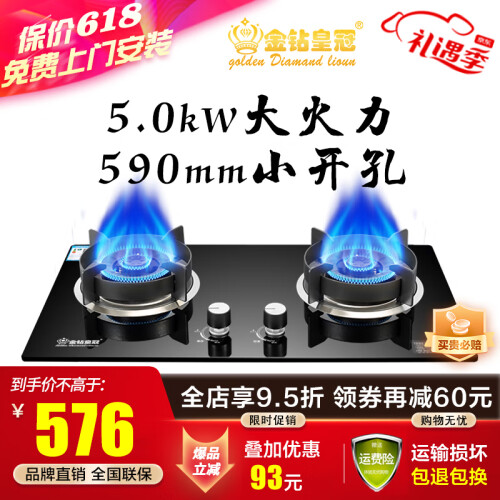 金钻皇冠(golden diamond grown)【590mm小开孔】大火力燃气灶小尺寸煤气灶嵌入式天然气灶双灶60cm挖孔家用猛火液化气石油气炉灶 5.0kW大火力玻璃面板J17【天然气】