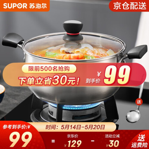 当前的位置: 首页 > 今日值得买 > 苏泊尔(SUPOR)304不锈钢时尚小红圈汤锅大小号复底炖锅火锅煮面锅 燃气电磁炉通用 升级加厚防烫款(22CM 适用2-3人)