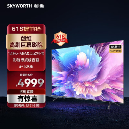 当前的位置: 首页 > 今日值得买 > 创维电视 85A5 Pro 电视机 85英寸 120Hz MEMC 影院级音画 3+32G 4K护眼声控全面屏 以旧换新