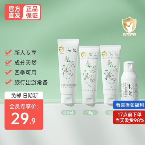 当前的位置: 首页 > 今日值得买 > 松达婴儿面霜护肤大礼包身体乳沐浴露爽身露宝宝用品 霜18g+乳20ml+沐30ml+爽身露30ml