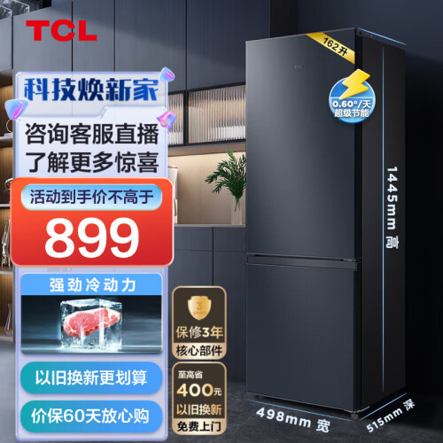 当前的位置: 首页 > 今日值得买 > TCL冰箱 162升双门养鲜冰箱 节能环保 38分贝低音 121升大冷藏 环保材质 快速制冷小冰箱 R162L3-BZJ 晶岩灰