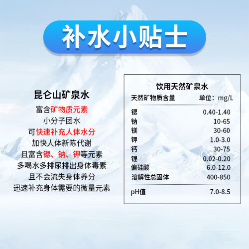 当前的位置: 首页 > 今日值得买 > 昆仑山雪山矿泉水550mlx24瓶整箱装天然弱碱水高端饮用水家庭办公矿泉水 昆仑山550ml*24瓶