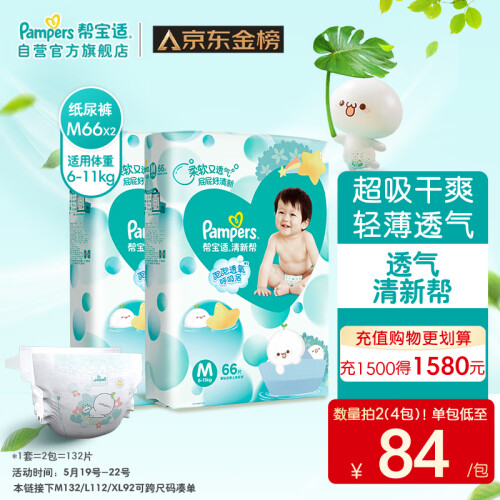 当前的位置: 首页 > 今日值得买 > 帮宝适清新帮纸尿裤M132片(6-11kg)尿不湿尿裤 超薄透气