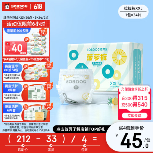 当前的位置: 首页 > 今日值得买 > 巴布豆(BOBDOG)新菠萝拉拉裤XXL码34片(15kg以上)大码婴儿尿不湿 弱酸成长裤超薄