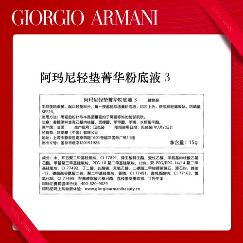 当前的位置: 首页 > 今日值得买 > 阿玛尼红气垫褶裥皮气垫#3自然白 控油遮瑕持妆粉底液 生日礼物送女友