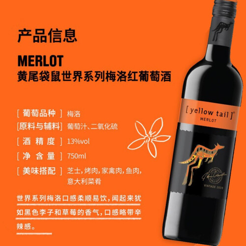 当前的位置: 首页 > 今日值得买 > 黄尾袋鼠(Yellow Tail)袋鼠红酒 世界系列缤纷系列原瓶进口干红葡萄酒整箱装750ml*6 梅洛