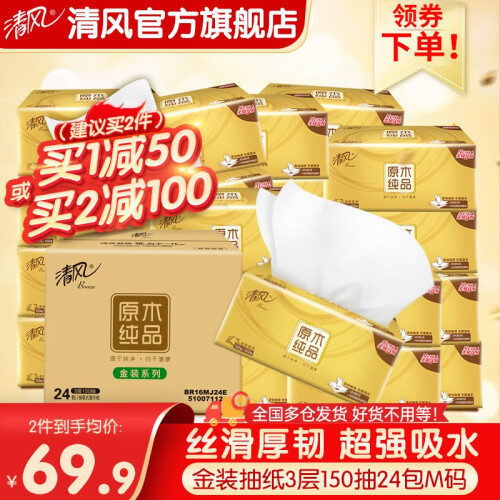 当前的位置: 首页 > 今日值得买 > 清风 原木金装抽纸厚韧M码3层150抽24包抽纸纸巾餐巾纸卫生纸整箱 纸巾