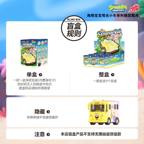 当前的位置: 首页 > 今日值得买 > POP MART泡泡玛特海绵宝宝观光小车系列模型载具手办盲盒生日礼物 单盒(随机发 拍9个非整盒)