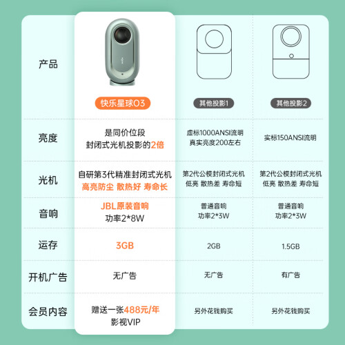 当前的位置: 首页 > 今日值得买 > 快乐星球 O3 投影仪家用 投影机 智能家庭影院(双倍亮度 JBL原装音响 3G运存 极米系统)