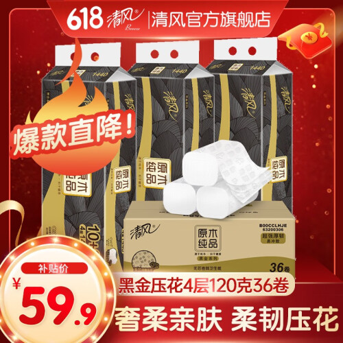 当前的位置: 首页 > 今日值得买 > 清风 黑金无芯卷纸4层120克36卷整箱家用纸巾家用手纸厕纸卫生纸