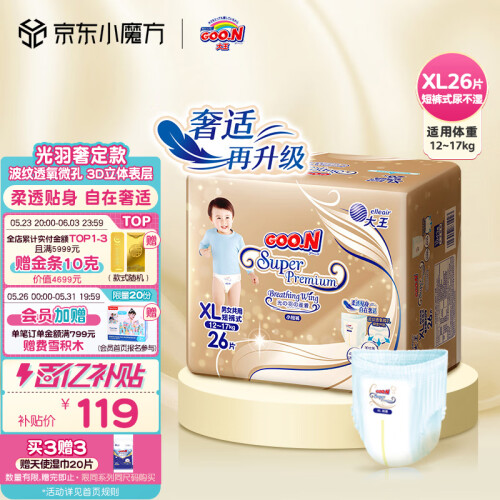 当前的位置: 首页 > 今日值得买 > 大王(GOO.N)光羽奢定款 自在之息短裤型尿不湿 XL26片(12-17kg)婴儿柔透贴身