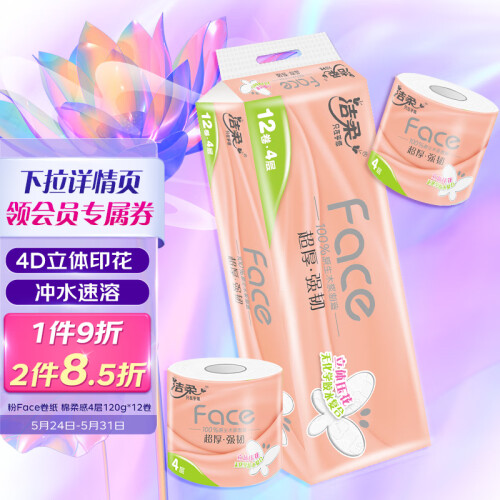 当前的位置: 首页 > 今日值得买 > 洁柔卷纸 粉Face 棉柔感4层120g卫生纸*12卷(4D立体印花 冲水速溶)