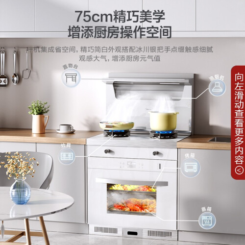 当前的位置: 首页 > 今日值得买 > 美的(Midea)蒸烤一体集成灶 油烟机燃气灶 5.2KW火力 可换向风道 电热自清洁 75cm白色小尺寸 TX05 天然气